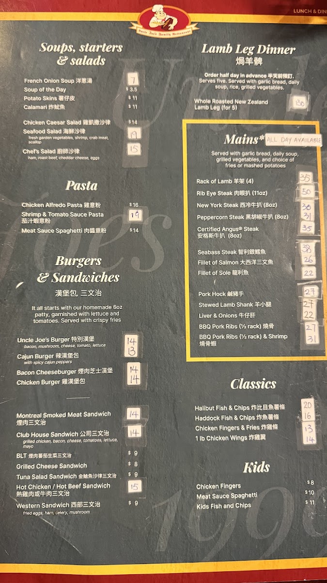 The menu at Uncle Joe’s Family Restaurant offers a variety of options spanning breakfast, lunch, and dinner, focusing on Canadian and Western cuisine with a steakhouse influence. It is organized into several categories including entrées, classic pasta dishes, and beverages.